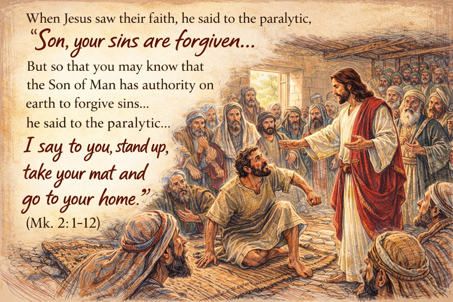Hence, true healing would involve not only physical healing but also social inclusion, including them into the social fold; that is, providing them with an assurance that their sins have been forgiven and hence, they belong to the community of God’s people. This is the context in which Jesus extends forgiveness to the paralyzed man: “Son, your sins are forgiven.”