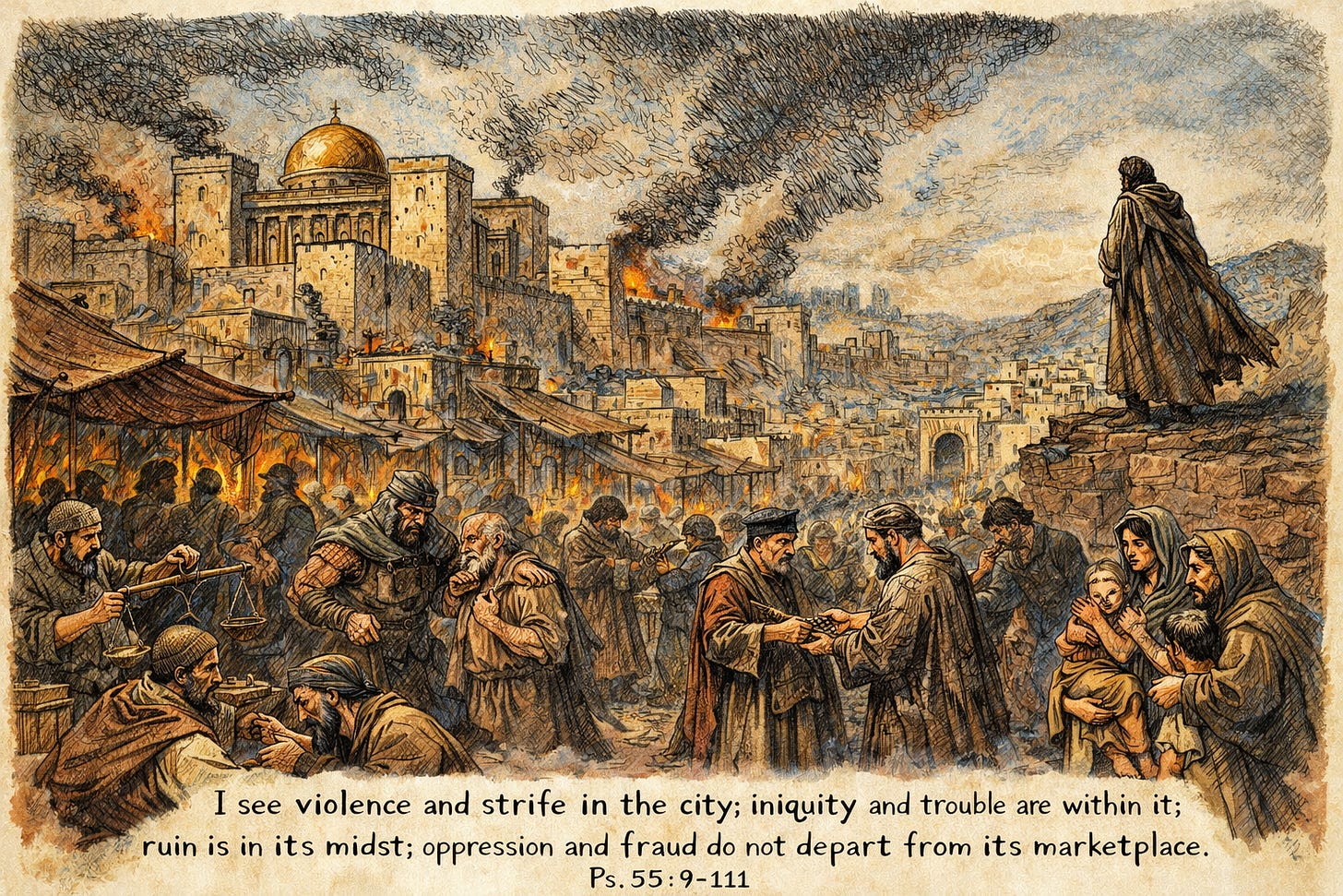 The Psalmist further describes the evils in the society. He says, “I see violence and strife in the city; iniquity and trouble are within it; ruin is in its midst; oppression and fraud do not depart from its marketplace.” (Ps. 55: 9-11)