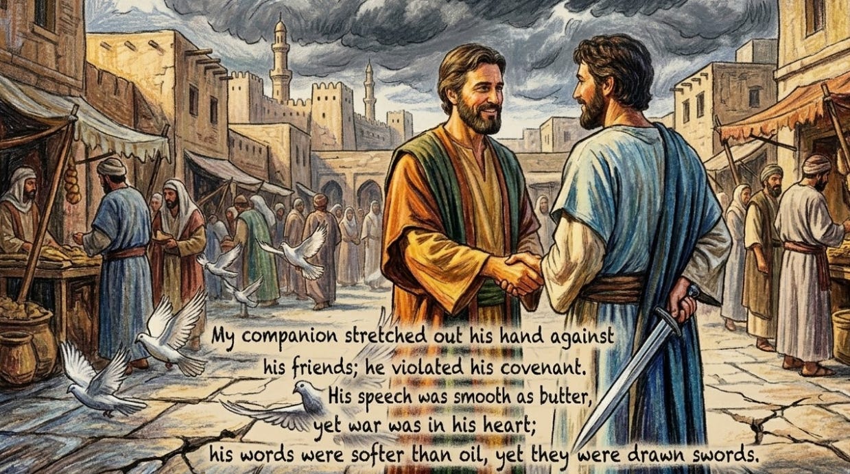 While emphasising this, the Psalmist is particular that we should not lose sight of our individual complicity and participation in all these sins. In verses 20 and 21, we read: “My companion stretched out his hand against his friends; he violated his covenant. His speech was smooth as butter, yet war was in his heart; his words were softer than oil, yet they were drawn swords.”